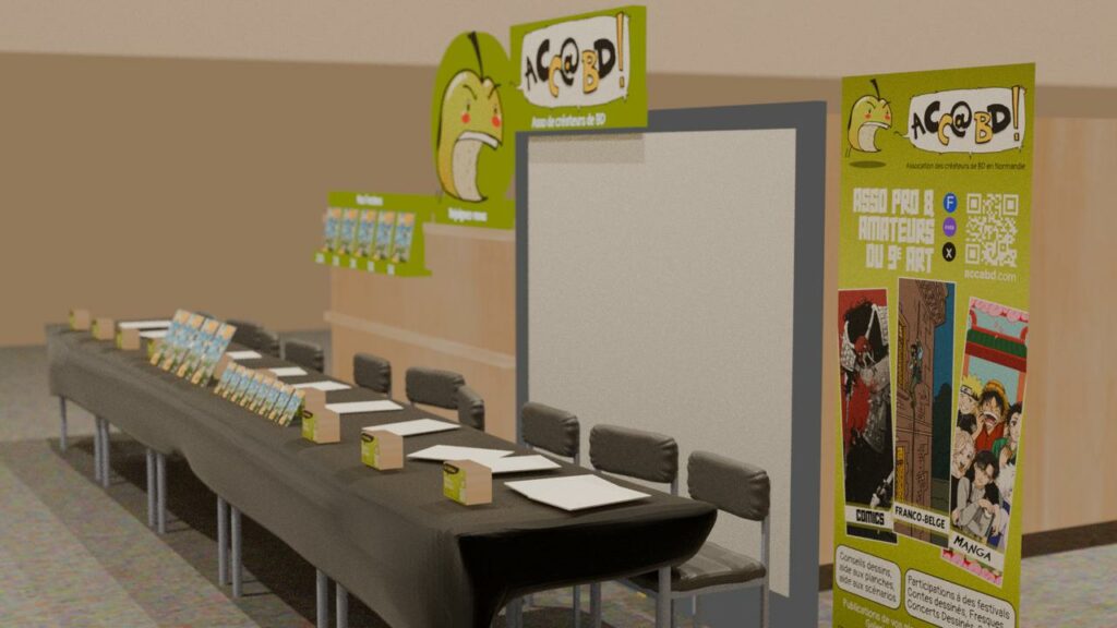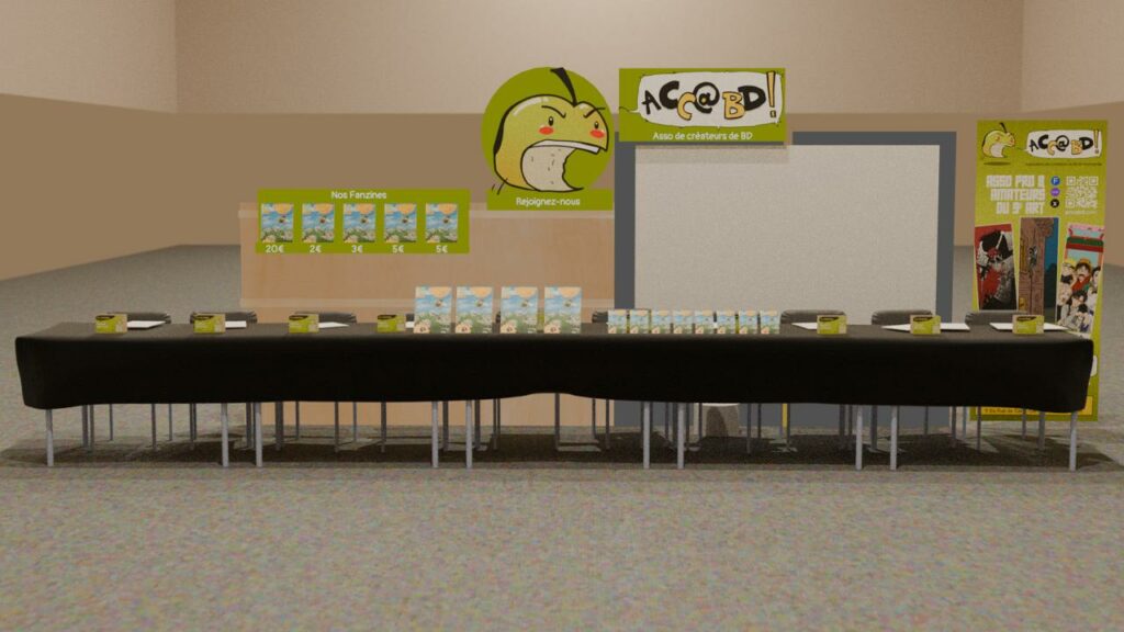 Amélioration du stand AccaBD 2024 à 2027travail en cours.on a déjà la nappe noire, les blotickets.le roll-up et en cours Vue 3d de face vue 3d de 3/4
